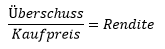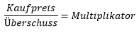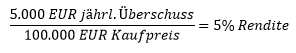 Kaufmännisch rechnet man meistens mit der Rendite, während Makler oftmals den Multiplikator angeben, den man auch als Vervielfältiger oder „das x-fache“ nennt. Ein Beispiel: Der Kauf einer Eigentumswohnung für 100.000 EUR mit einem Überschuss von 5.000 EUR p.a.